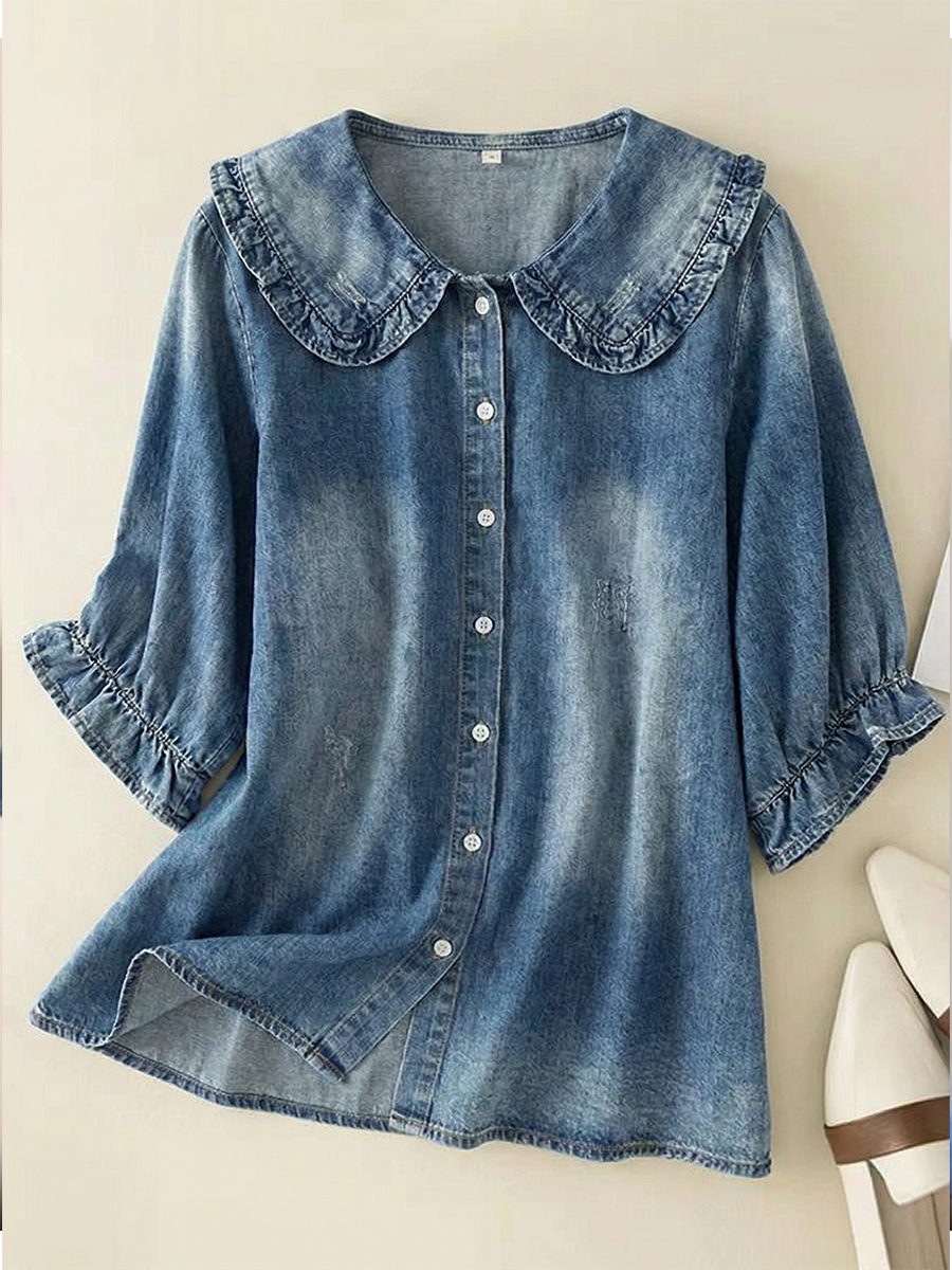 | L | 16 | Product Details: Product ID:ZR32XZJ24Q Gender: For Women Style: Casual Fit Type:Regular Shirt Length: Over Hip Sleeves Length:3/4 sleeve Collar: Peter Pan Collar Material: 100% Cotton Material Stretch: No Stretch Pattern Type: Weight: 0.3kg Package: 1 x Shirt Size Guide For Women